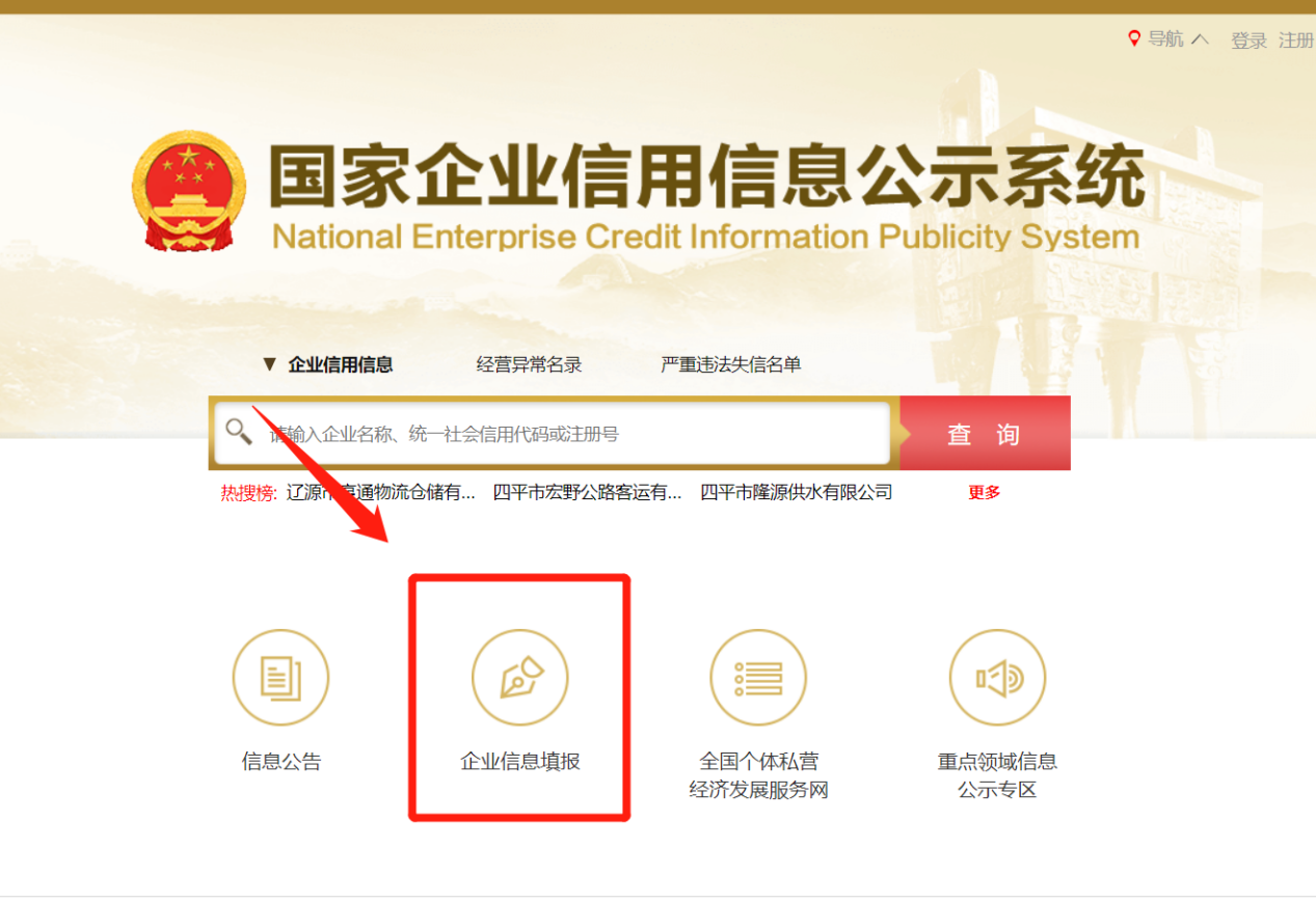登錄國(guó)家企業(yè)信用信息公示系統(tǒng):https://www.gsxt.gov.cn/index.html,登錄首頁(yè)面點(diǎn)擊“企業(yè)信息填報(bào)”,逐項(xiàng)如實(shí)填報(bào)。