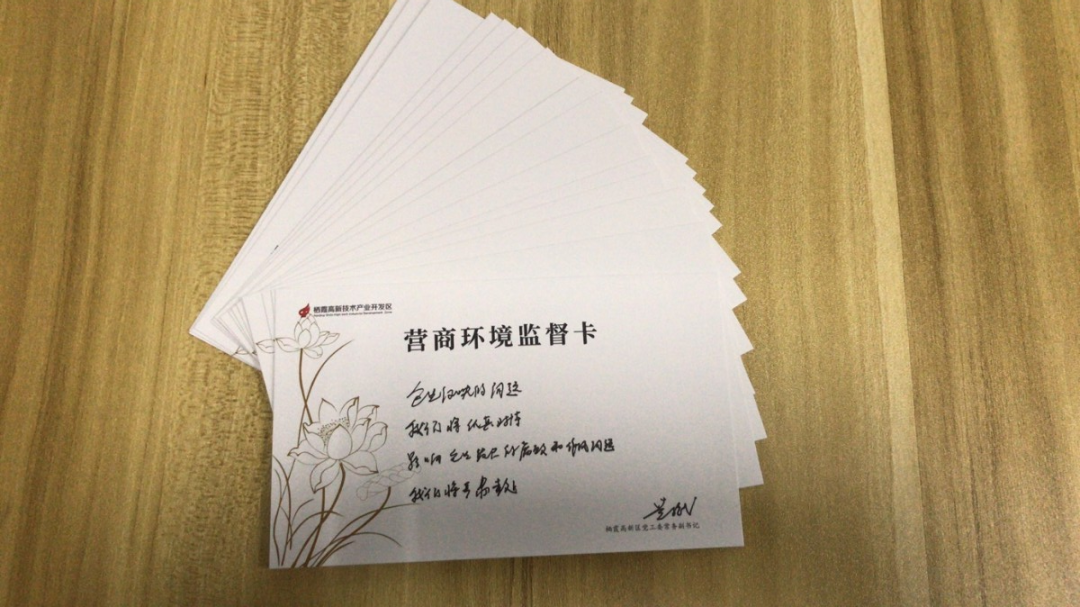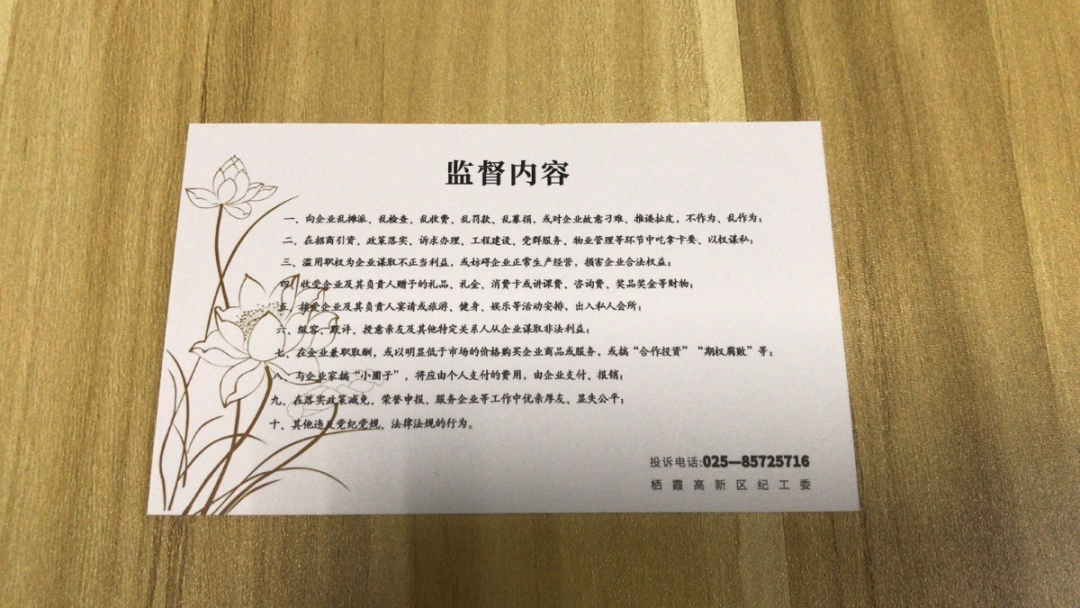 監(jiān)督卡不僅公布監(jiān)督電話,還以“負(fù)面清單”形式對權(quán)力尋租、利益輸送、“吃拿卡要”等腐敗行為和不作為、慢作為、亂作為等作風(fēng)問題進(jìn)行了重點(diǎn)提示。棲霞高新區(qū)通過全員走訪、服務(wù)窗口集中擺放等方式,已發(fā)放監(jiān)督卡400多張,企業(yè)在收到監(jiān)督卡后紛紛點(diǎn)贊。