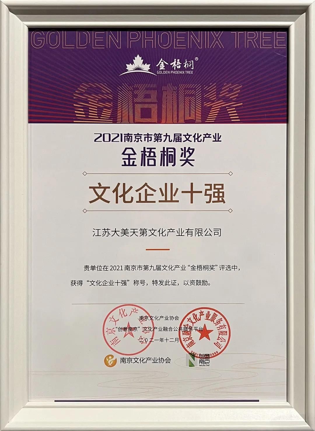 2021·南京市第九屆文化產(chǎn)業(yè)金梧桐獎(jiǎng)“文化企業(yè)十強(qiáng)”,連續(xù)四年當(dāng)選。