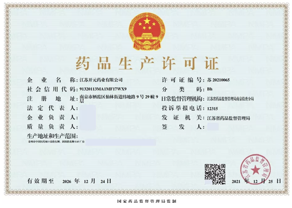 經(jīng)過(guò)不懈努力,2021年12月25日,江蘇開(kāi)元藥業(yè)有限公司順利獲得了由江蘇省藥品監(jiān)督管理局簽發(fā)的藥品研發(fā)機(jī)構(gòu)作為上市持有人(MAH)的《藥品生產(chǎn)許可證》B證。