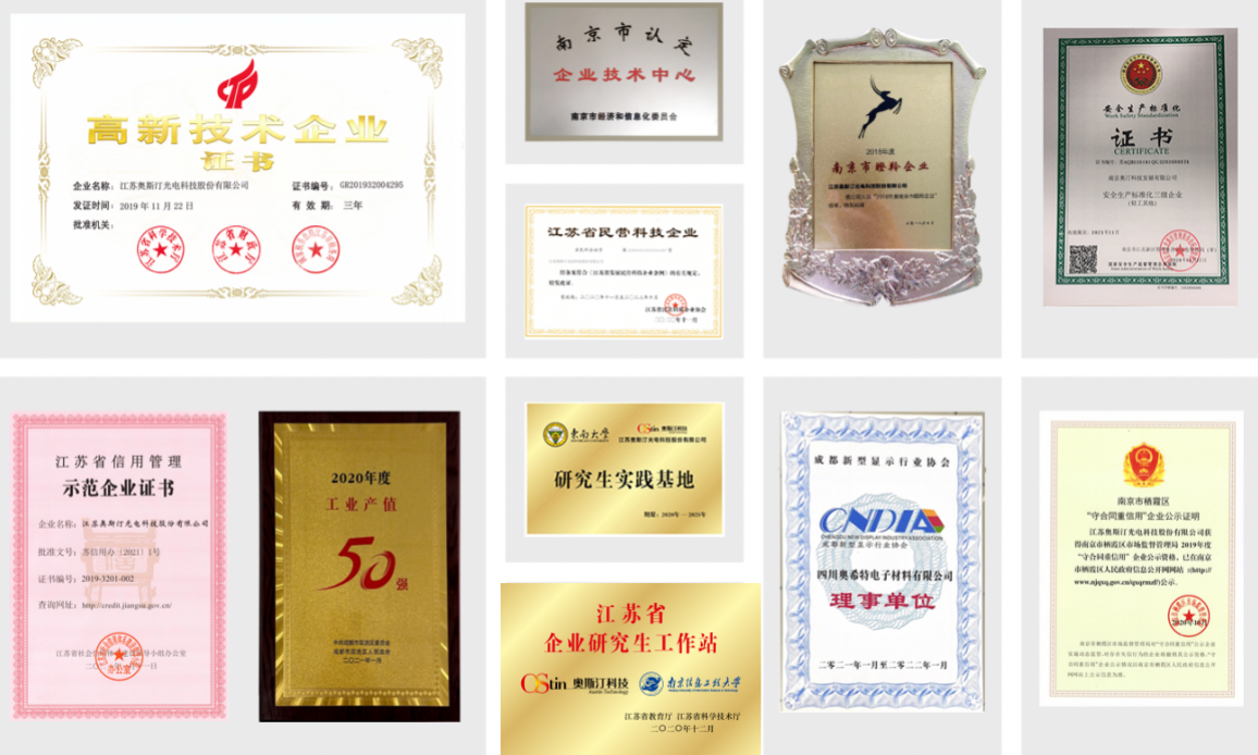江蘇奧斯汀光電科技股份有限公司于2018年4月入選南京市首批“瞪羚企業(yè)”榜單,并且陸續(xù)入選“專精特新”、“江蘇省科技型中小企業(yè)”、“江蘇省民營科技型企業(yè)”、“江蘇省企業(yè)信用管理貫標(biāo)”、“南京市企業(yè)研發(fā)中心”、“守合同重信用企業(yè)”等;3次被評為了“國家級高新技術(shù)企業(yè)”;取得4個注冊商標(biāo);獲得ISO9001、ISO14001、16949體系認(rèn)證。