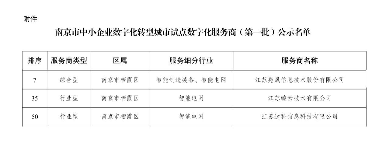 近日,南京市中小企業(yè)數(shù)字化轉(zhuǎn)型城市試點(diǎn)工作迎來重要進(jìn)展,首批數(shù)字化服務(wù)商名單正式公布。棲霞高新區(qū)科技創(chuàng)新沃土再結(jié)碩果。江蘇翔晟信息技術(shù)股份有限公司、江蘇臻云技術(shù)有限公司、江蘇達(dá)科信息科技有限公司三家企業(yè)憑借其在各自領(lǐng)域的領(lǐng)先技術(shù)實(shí)力、成熟的數(shù)字化轉(zhuǎn)型解決方案及豐富的服務(wù)經(jīng)驗(yàn),實(shí)力斬獲首批“南京市中小企業(yè)數(shù)字化轉(zhuǎn)型城市試點(diǎn)數(shù)字化服務(wù)商”榮譽(yù)。