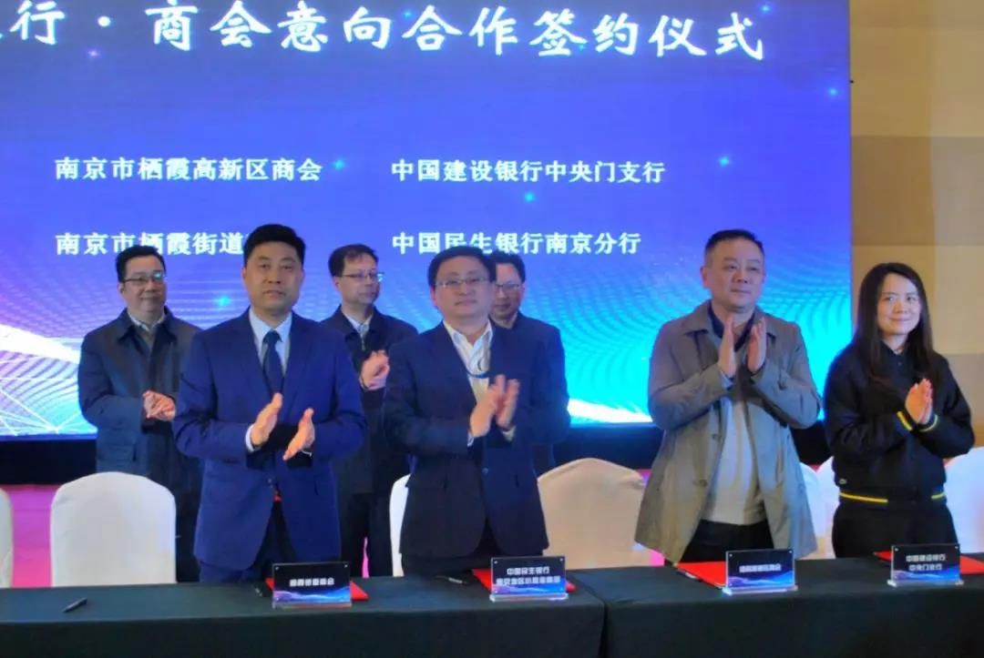 棲霞高新區(qū)企業(yè)服務處處長、商會常務副會長蔣尚平和中國建設銀行股份有限公司中央門支行行長、黨委書記羅曼潔簽署高新區(qū)商會與建設銀行意向合作協(xié)議。