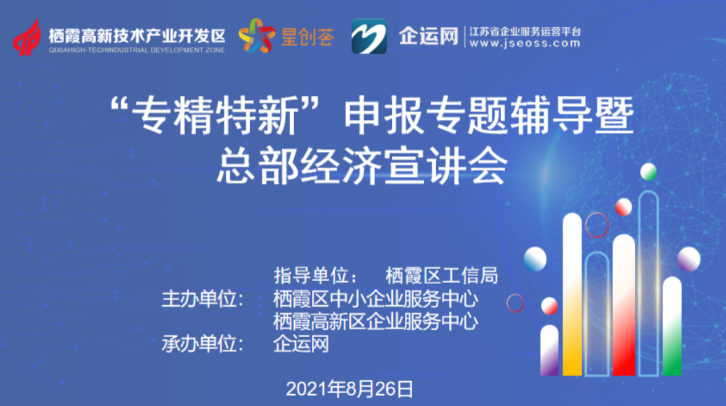 為深入推進(jìn)“專精特新”企業(yè)培育工程,幫助企業(yè)了解當(dāng)前形勢(shì)與企業(yè)轉(zhuǎn)型升級(jí)高質(zhì)量發(fā)展思路等問題;同時(shí)為穩(wěn)步推動(dòng)總部經(jīng)濟(jì)建設(shè),吸引優(yōu)質(zhì)人才和企業(yè)落地生根,加快形成棲霞高新區(qū)經(jīng)濟(jì)發(fā)展新生態(tài),8月26日,棲霞高新區(qū)聯(lián)合棲霞區(qū)工信局、棲霞區(qū)中小企業(yè)服務(wù)中心、企運(yùn)網(wǎng),線上開展“專精特新”申報(bào)專題輔導(dǎo)暨總部經(jīng)濟(jì)宣講會(huì),本次活動(dòng)吸引了120余名企業(yè)負(fù)責(zé)人觀看。