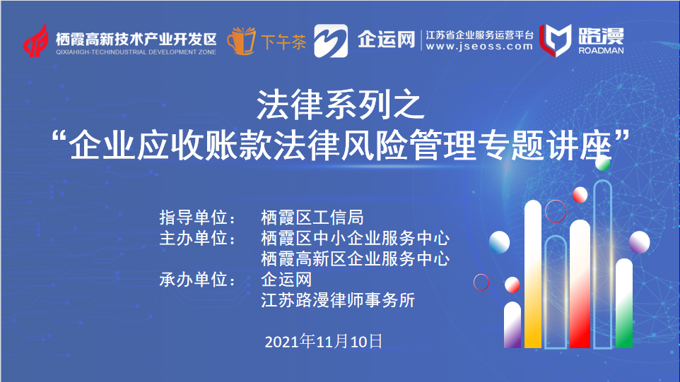 為幫助園區(qū)企業(yè)了解年終應(yīng)收賬款的常見風(fēng)險(xiǎn)、催收技巧及注意事項(xiàng),做好年終應(yīng)收賬款的風(fēng)險(xiǎn)管理工作,11月10日,由棲霞區(qū)工信局指導(dǎo),棲霞區(qū)中小企服中心、棲霞高新區(qū)企服中心主辦,企運(yùn)網(wǎng)、江蘇路漫律師事務(wù)所承辦的“法律系列之‘企業(yè)應(yīng)收賬款法律風(fēng)險(xiǎn)管理’專題講座”成功舉辦,活動(dòng)吸引了20余家企業(yè)代表參會(huì)。