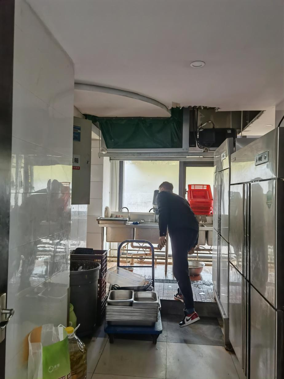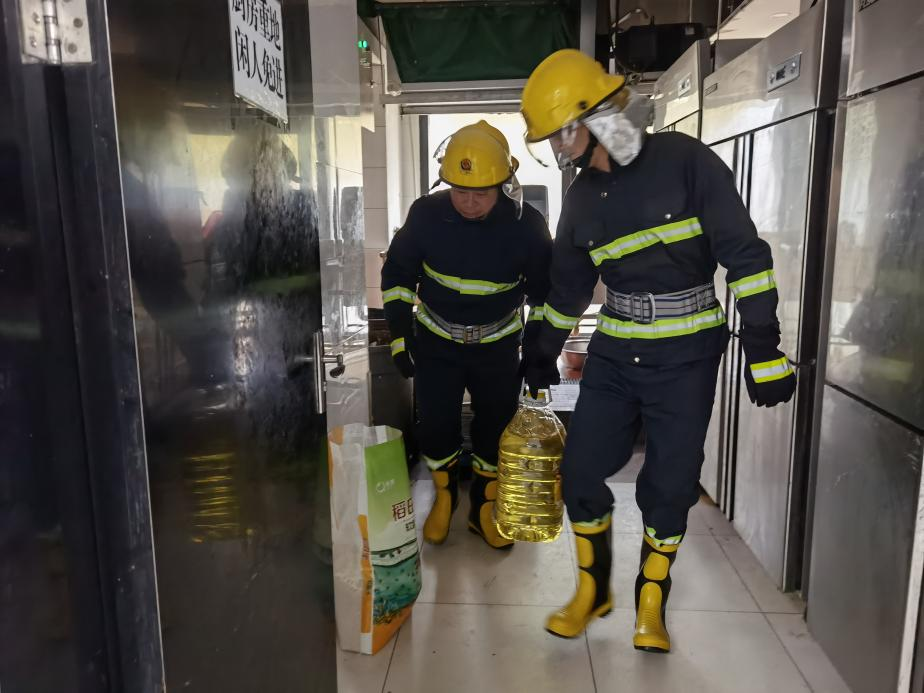 園區(qū)組織應(yīng)急搶險,搶險滅火小組全副武裝趕赴現(xiàn)場,使用消防水帶、水槍等裝備對著火處實(shí)施打擊,移走廚房內(nèi)可燃物,切斷二層供電。