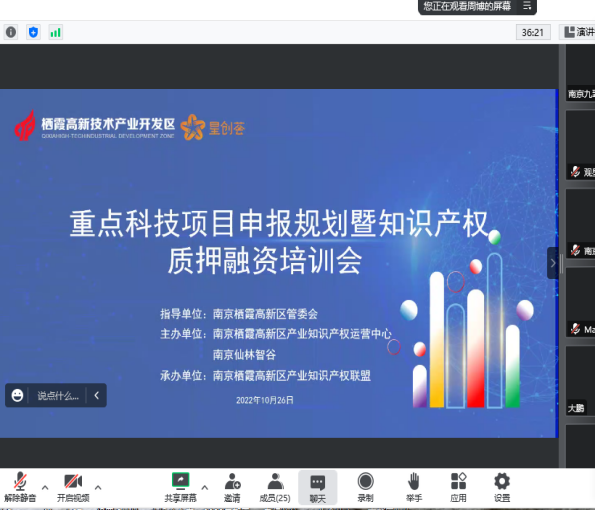 為幫助園區(qū)小微企業(yè)做好項目申報規(guī)劃及豐富融資渠道,10月26日下午,由棲霞高新區(qū)管委會指導(dǎo)、高新區(qū)產(chǎn)業(yè)知識產(chǎn)權(quán)運營中心主辦、高新區(qū)產(chǎn)業(yè)知識產(chǎn)權(quán)聯(lián)盟承辦的項目申報規(guī)劃暨知識產(chǎn)權(quán)質(zhì)押融資線上培訓(xùn)講座成功舉辦,20余家企業(yè)線上參加此次活動。