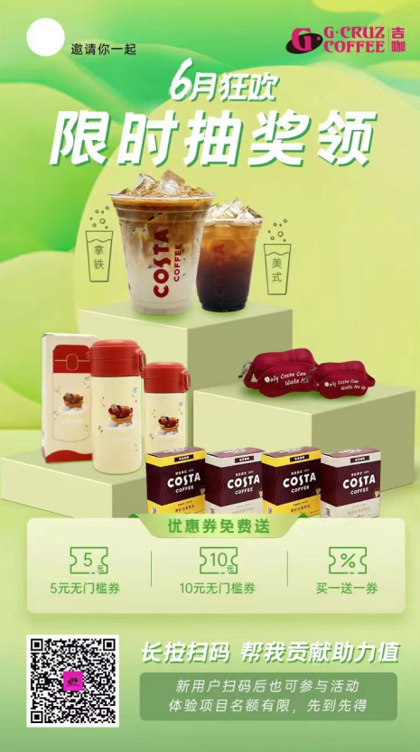 本次Costa推出6月狂歡活動,參加抽獎活動可得免費咖啡還有更多優(yōu)惠券可以領(lǐng)取