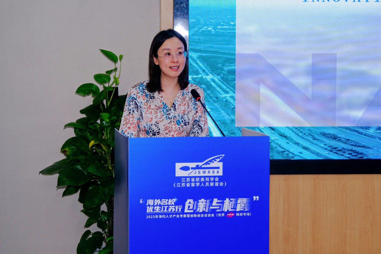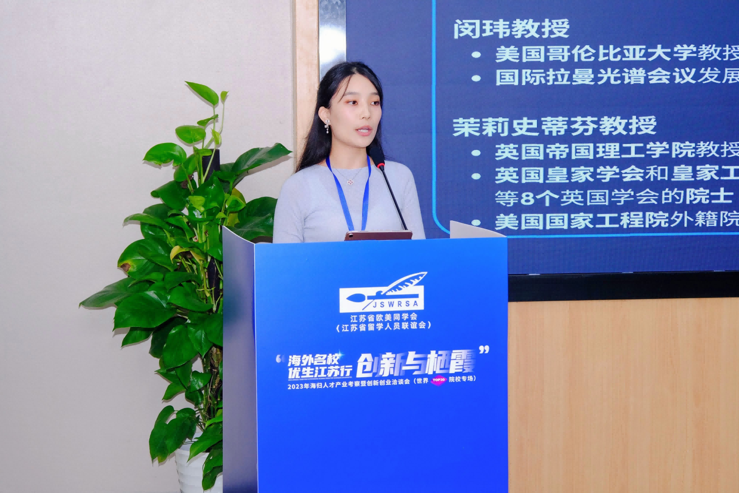 隨后,南京棲霞科技產(chǎn)業(yè)發(fā)展有限公司副總經(jīng)理朱潔代表高新區(qū)介紹了區(qū)域發(fā)展、相關(guān)產(chǎn)業(yè)資源優(yōu)勢(shì)、政策支持等創(chuàng)新創(chuàng)業(yè)環(huán)境,并誠(chéng)摯邀請(qǐng)各位海外英才扎根園區(qū),成就事業(yè)。