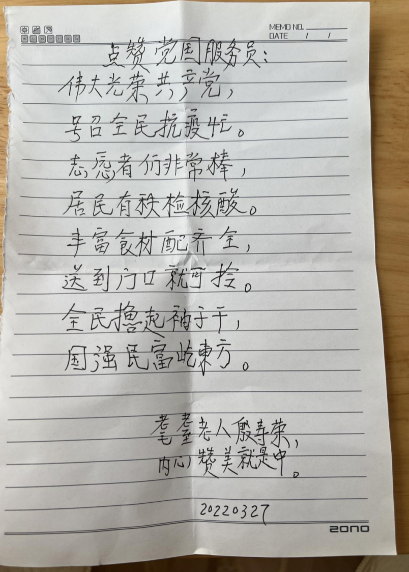 疫情當(dāng)前,宅在家里的老人希望用簡潔通俗的語句為奮戰(zhàn)在一線的黨員干部們、社區(qū)工作者、志愿者加油打氣。老人說,他年紀(jì)大了,不能穿上鮮艷的紅馬甲到一線去揮灑激情,希望通過文字為社區(qū)輸送來自群眾的理解和支持。