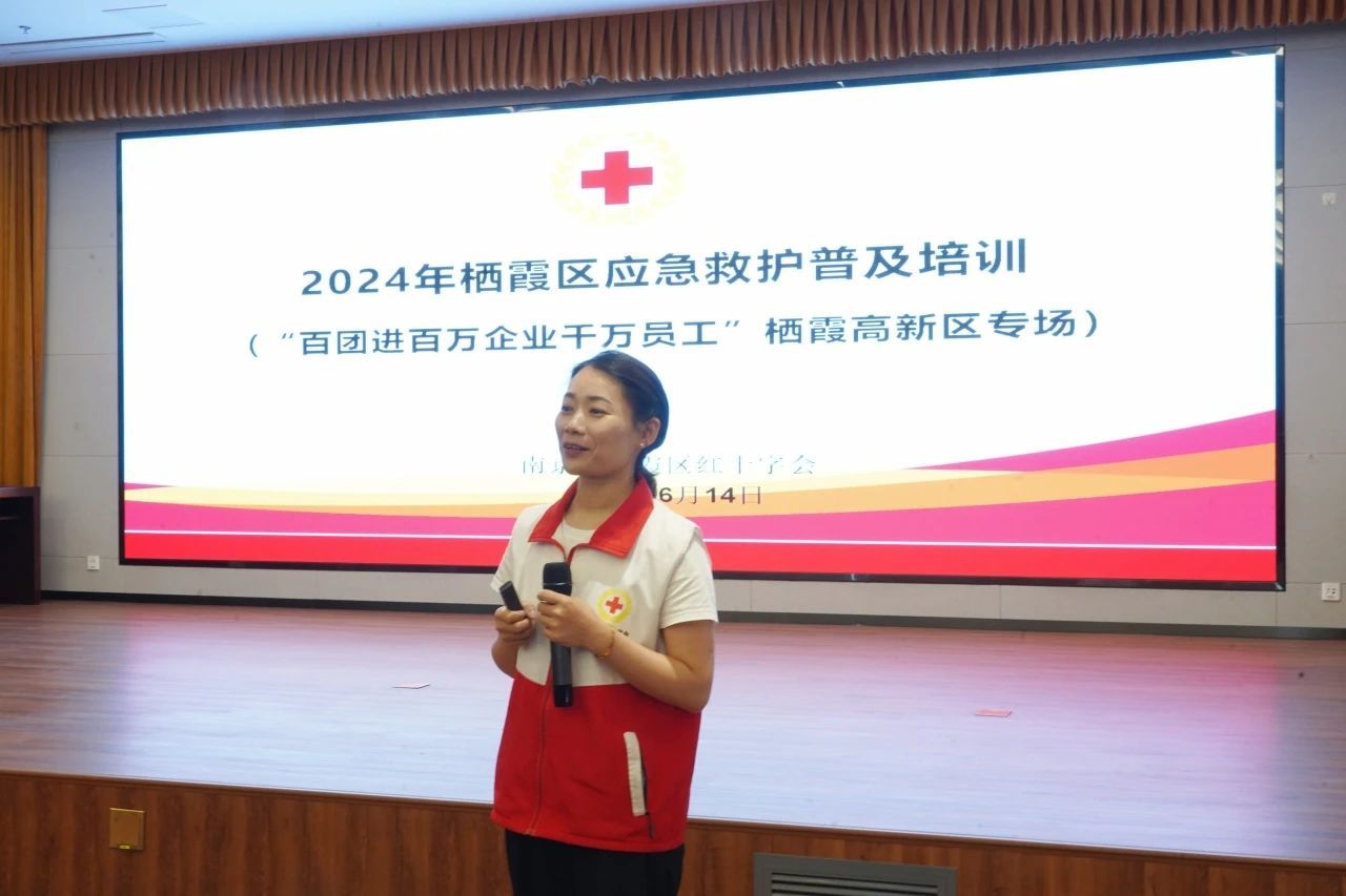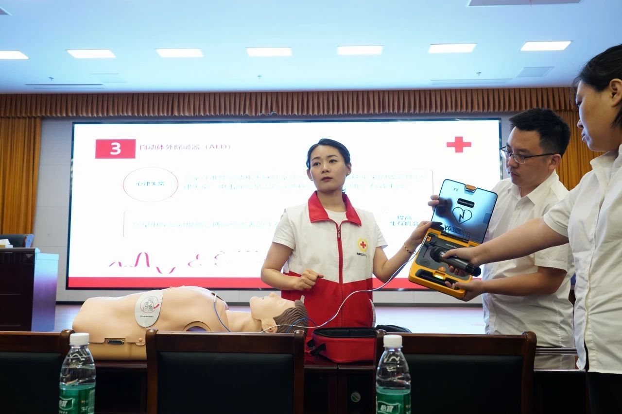 南京市紅十字會主任導(dǎo)師祁李萍從如何開展心肺復(fù)蘇操作、人員中暑急救、緊急外傷處置等方面開展了緊急救護知識培訓(xùn)。