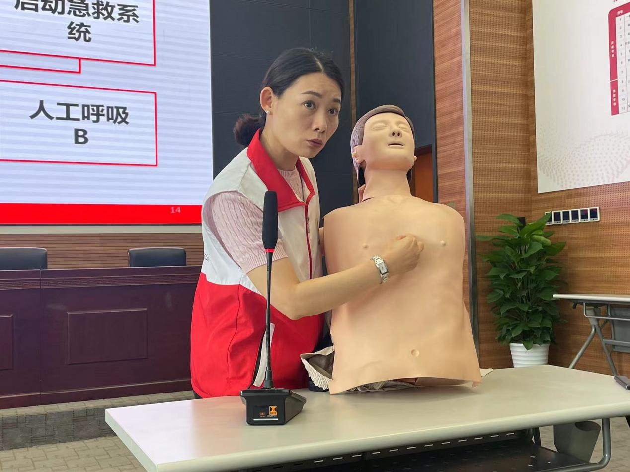 本次活動邀請南京市紅十字會主任導(dǎo)師祁李萍,從心肺復(fù)蘇操作、體外自動除顫儀的使用、開放性外傷先期處置等方面,開展緊急救護知識培訓(xùn)。