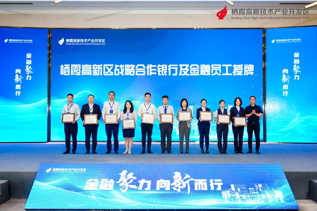 棲霞高新區(qū)為10家戰(zhàn)略合作銀行代表授予“棲霞高新區(qū)金融員工證”。