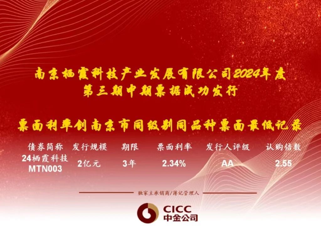 2024年7月10日,南京棲霞科技產(chǎn)業(yè)發(fā)展有限公司在銀行間債券市場成功發(fā)行中票2億元,期限為3年,票面利率2.34%。本次發(fā)行是信用發(fā)行,創(chuàng)有史以來南京市同資質(zhì)同期限同品種債券最低利率,亦創(chuàng)棲霞高新區(qū)融資貸款以來同期限最低利率!