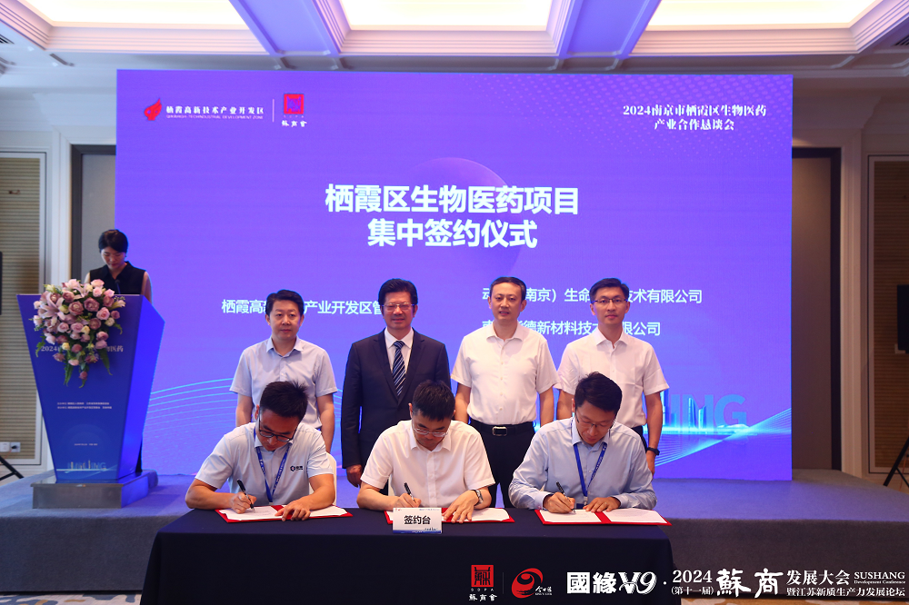 創(chuàng)新是引領(lǐng)發(fā)展的第一動(dòng)力,企業(yè)是經(jīng)濟(jì)健康運(yùn)行的源泉活水。會(huì)上,隆重舉行了棲霞區(qū)生物醫(yī)藥項(xiàng)目集中簽約儀式。棲霞高新技術(shù)產(chǎn)業(yè)開發(fā)區(qū)管委會(huì)主任黃斌與中石化碳產(chǎn)業(yè)科技股份有限公司、南京中科云帆生物技術(shù)有限公司、南京道潤(rùn)醫(yī)學(xué)科技有限公司、動(dòng)康(南京)生命科學(xué)技術(shù)有限公司、南京能德新材料技術(shù)有限公司等五家優(yōu)質(zhì)企業(yè)共同簽署了合作協(xié)議。王秘書長(zhǎng)、丁處長(zhǎng)、郭區(qū)長(zhǎng)、楊區(qū)長(zhǎng)見(jiàn)證簽約。此次簽約將為棲霞生物醫(yī)藥產(chǎn)業(yè)注入新的活水,激起新的發(fā)展浪潮。