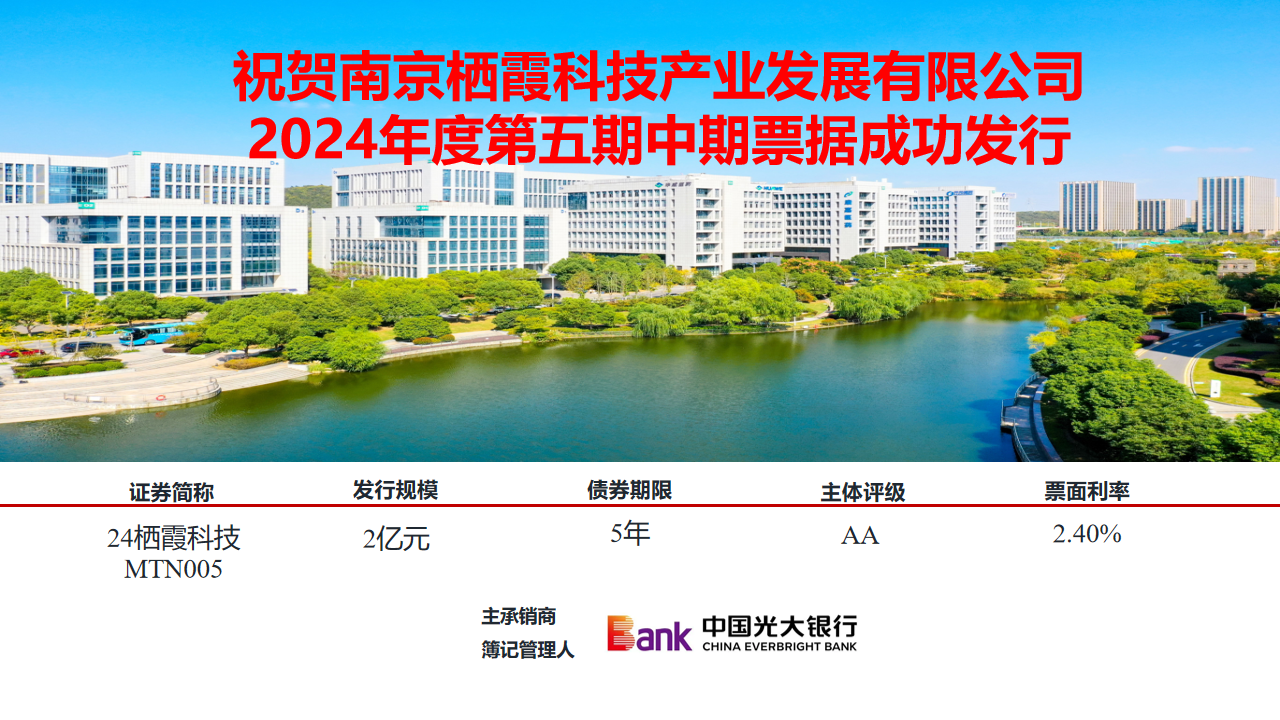 8月21日,南京棲霞科技產業(yè)發(fā)展有限公司在銀行間債券市場成功發(fā)行中期票據(jù)2億元,期限為5年,票面利率2.4%。本次發(fā)行是信用發(fā)行,創(chuàng)棲霞高新區(qū)同期限同品種債券最低利率!