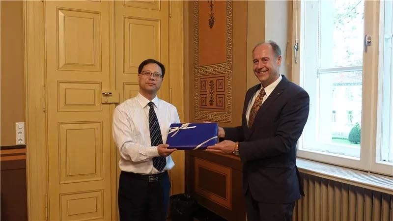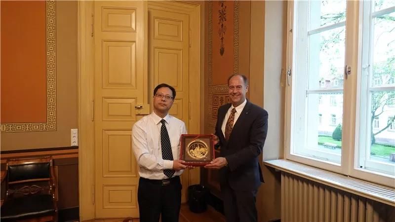 最后Uwe Muuss帶著團(tuán)組成員參觀悠久歷史的校長(zhǎng)辦公大樓,雙方互贈(zèng)禮品并合影留念。