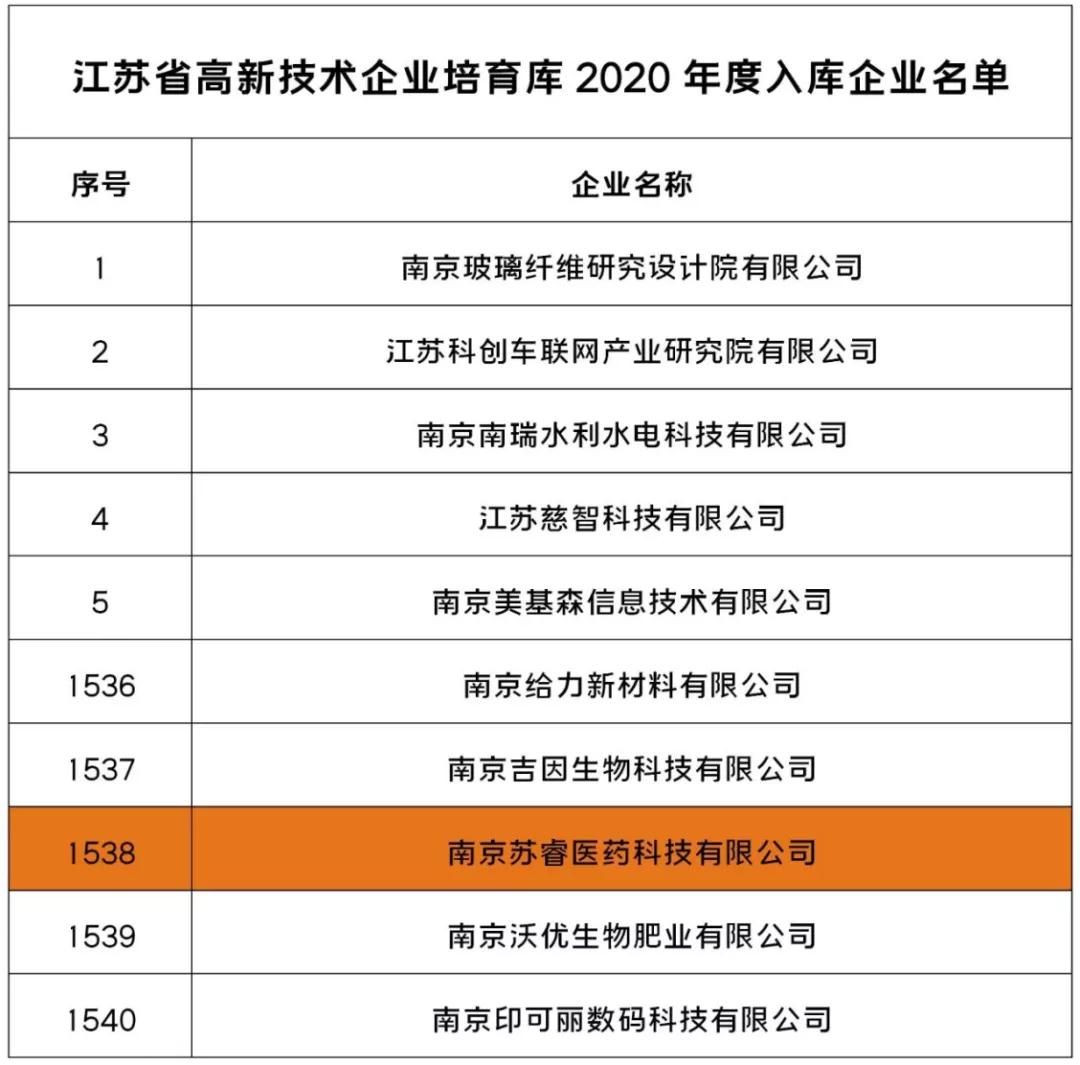 南京蘇睿醫(yī)藥科技有限公司成功入選2020年江蘇省高新技術(shù)企業(yè)培育庫。
