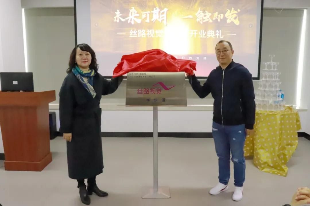 典禮現(xiàn)場,鐘部長與絲路視覺副總裁李總共同對(duì)絲路視覺華東區(qū)進(jìn)行揭牌,徐主任與絲路視覺副總裁胡總開啟香檳,慶祝絲路視覺華東區(qū)正式開業(yè)。