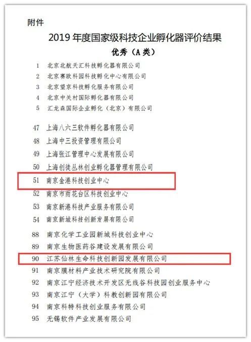 近日,科技部火炬中心公布了2019年度國(guó)家級(jí)科技企業(yè)孵化器評(píng)價(jià)結(jié)果。棲霞高新區(qū)國(guó)家級(jí)孵化器南京金港科技創(chuàng)業(yè)中心、江蘇生命科技創(chuàng)新園國(guó)際生物醫(yī)藥孵化器共同獲評(píng)A類(優(yōu)秀),是棲霞行政區(qū)劃內(nèi)唯一獲評(píng)A類的單位,創(chuàng)歷史最優(yōu)成績(jī)。南京紫東國(guó)際企業(yè)孵化器獲評(píng)B類(良好)。