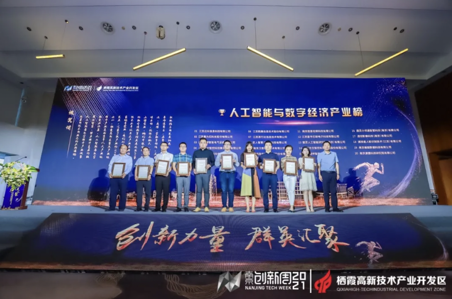 南京市統(tǒng)計(jì)局副局長(zhǎng)方愛(ài)軍為人工智能與數(shù)字經(jīng)濟(jì)產(chǎn)業(yè)榜單獲獎(jiǎng)企業(yè)代表頒獎(jiǎng)。