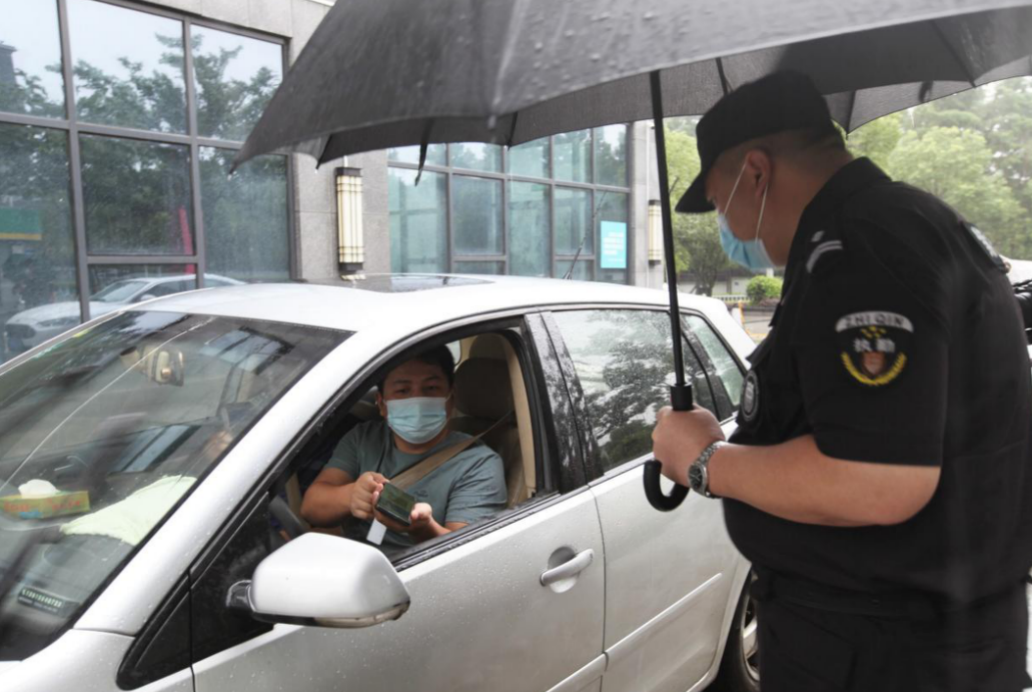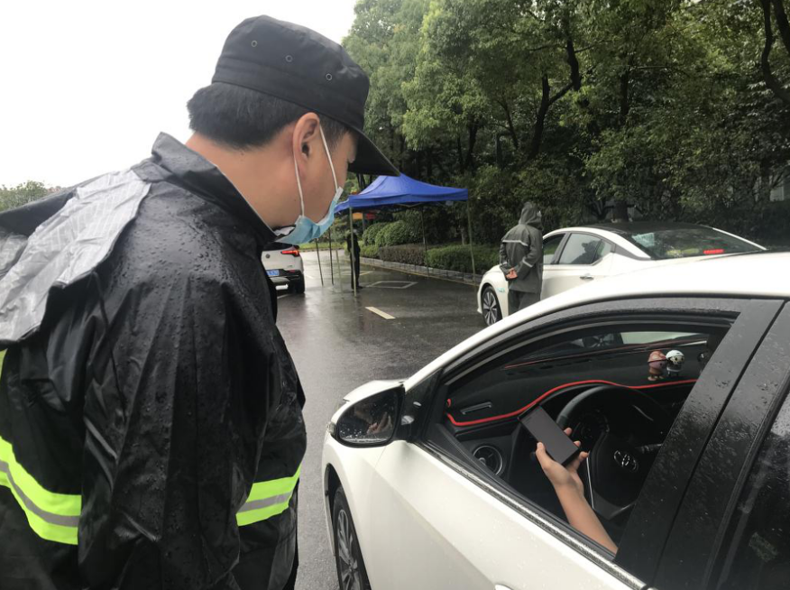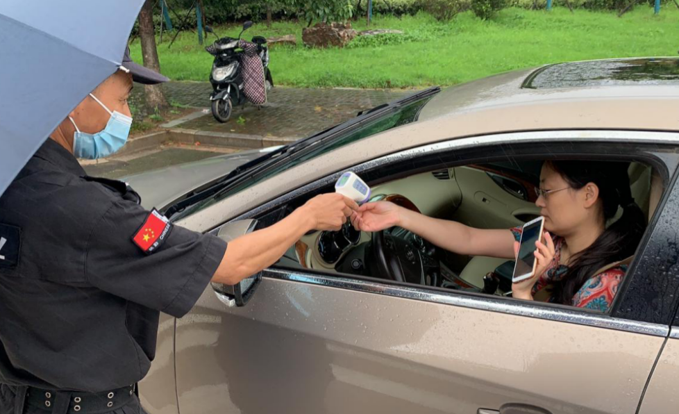 高新區(qū)工作人員查驗(yàn)入園車主“蘇康碼”并進(jìn)行體溫檢測(cè)