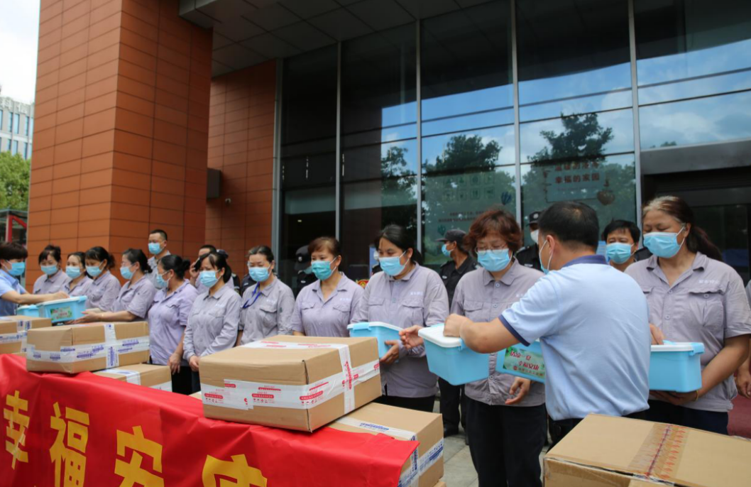 活動(dòng)現(xiàn)場(chǎng),棲霞高新區(qū)的慰問(wèn)代表們將一箱箱西瓜、糧油、飲料、方便面、消毒禮盒等暖心物資送到保安、保潔、工程等紫東物業(yè)一線職工手中,給炎炎夏日里仍堅(jiān)守工作崗位的他們帶來(lái)一縷清涼。