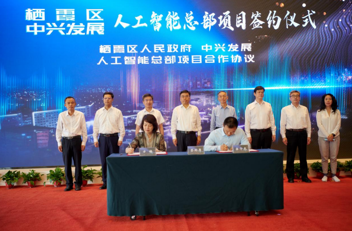 在簽約儀式上,南京市棲霞區(qū)人民政府常務(wù)副區(qū)長(zhǎng)宗寧虎,中興通訊股份有限公司董事、中興發(fā)展有限公司執(zhí)行董事常務(wù)副總裁、霞智科技有限公司董事長(zhǎng)方榕,上臺(tái)簽訂“棲霞區(qū)人民政府與中興發(fā)展人工智能總部項(xiàng)目合作協(xié)議”。