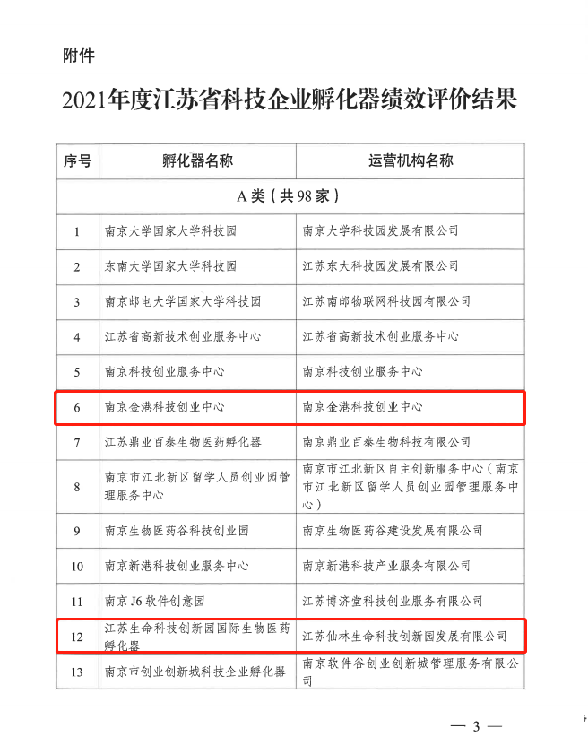 根據(jù)江蘇省科技廳公布的2021年度江蘇省科技企業(yè)孵化器績效評價結果,棲霞高新區(qū)自有三家國家級科技企業(yè)孵化器南京金港科技創(chuàng)業(yè)中心、江蘇生命科技創(chuàng)新園國際生物醫(yī)藥孵化器和南京紫東國際企業(yè)孵化器在省級績效評價全部獲評優(yōu)秀(A類)。