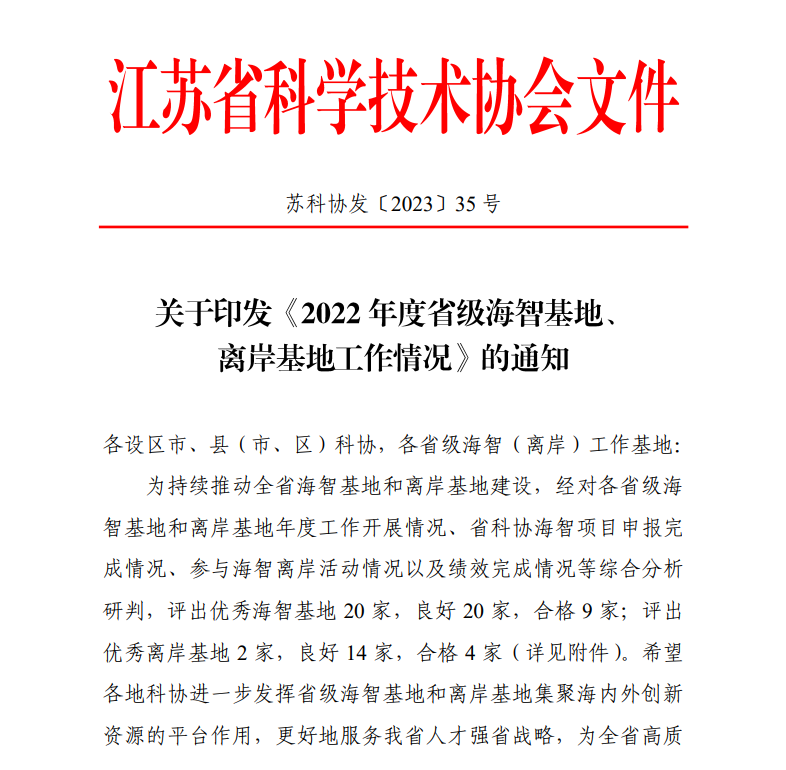 近日,江蘇省科協(xié)印發(fā)了《關(guān)于印發(fā)<2022年度省級海智基地、離岸基地工作情況>的通知》,南京棲霞海智基地在2022年度省級海智基地評估中獲評優(yōu)秀,連續(xù)三年獲此殊榮。