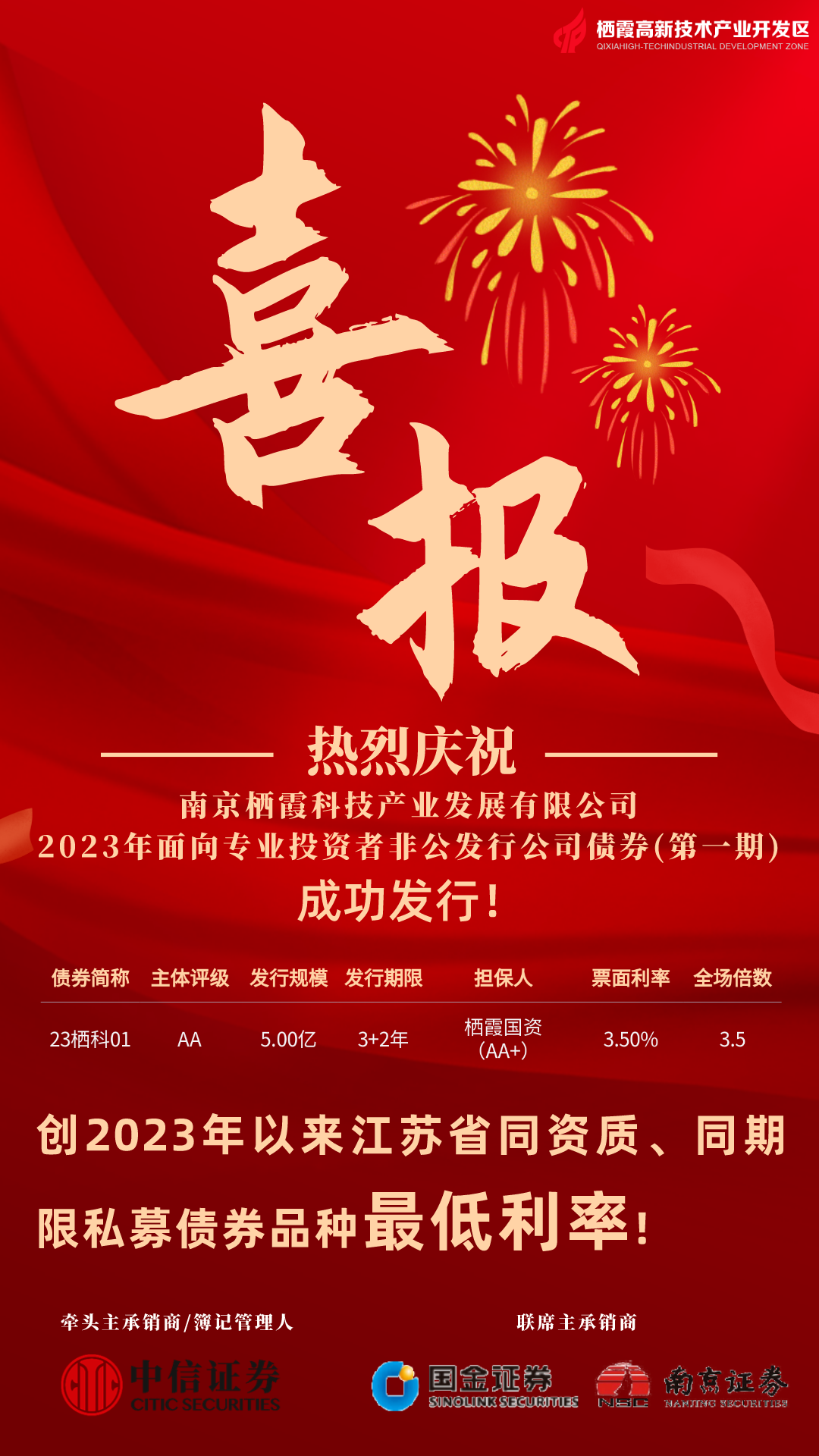 2023年5月10日,“南京棲霞科技產(chǎn)業(yè)發(fā)展有限公司2023年面向?qū)I(yè)投資者非公開發(fā)行公司債券(第一期)”成功發(fā)行,發(fā)行金額5億元,發(fā)行期限3+2年,最終票面利率3.50%,創(chuàng)2023年以來江蘇省同資質(zhì)、同期限私募債券品種最低利率!亦創(chuàng)棲霞高新區(qū)私募債發(fā)行以來最低利率!