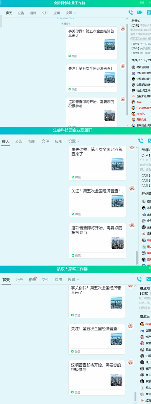 目前,第五次全國經(jīng)濟普查宣傳活動正在高新區(qū)如火如荼進行中,在各個園區(qū)開展多種形式的宣傳動員,通過懸掛宣傳橫幅、園區(qū)樓宇電梯電子屏循環(huán)播放、易拉寶、QQ和微信企業(yè)群等,發(fā)揮宣傳力量,廣泛宣傳經(jīng)濟普查的目的、意義和作用,提高廣大群眾對經(jīng)濟普查的認識,引導群眾積極支持配合普查工作,確保普查數(shù)據(jù)真實可信。