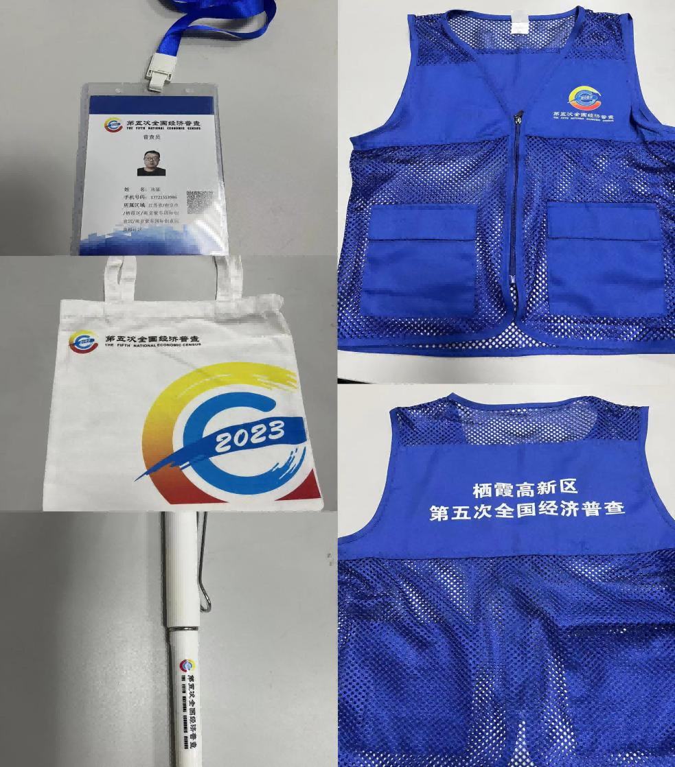 宣傳物資包含印有“第五次全國經(jīng)濟普查”宣傳標語字樣的筆、馬甲和手提包,用于普查員和普查指導員記錄和攜帶普查工作需要物品,同時將“五經(jīng)普”宣傳融入日常工作生活中,持有物資的工作人員成為移動的經(jīng)普招牌,方便社會各界了解經(jīng)濟普查相關知識。
